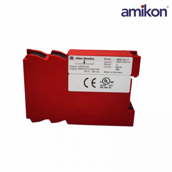 The 440R‑N23114 Safety Relay is a compact industrial safety monitoring relay designed to protect personnel and equipment in machinery applications. Part of the Guardmaster MSR126 series, it operates on 24V AC/DC power and features dual-channel safety inputs for monitoring emergency stop devices, safety gate switches, and other protective circuits. The 440R‑N23114 unit provides two normally open (N.O.) safety outputs and supports manual or automatic reset configurations. Engineered to meet high safety standards such as Category 4 / Performance Level e (EN ISO 13849-1), the 440R-N23114 ensures reliable fault detection and safe shutdown performance in demanding industrial environments.
