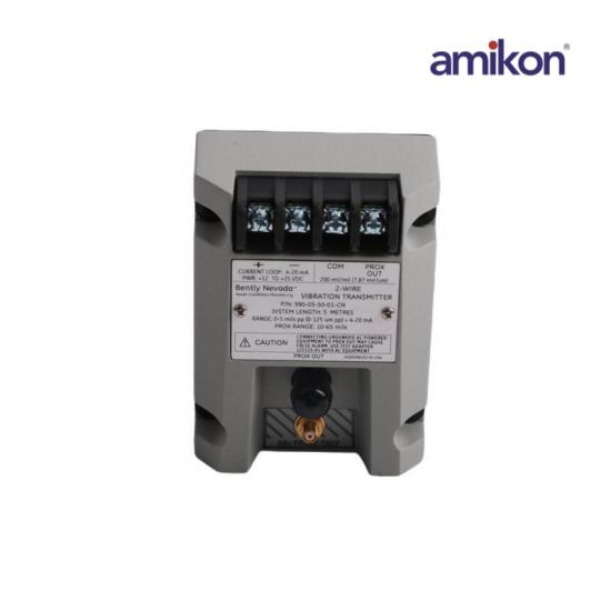 Features: The 990-05-50-01-CN is Vibration Transmitter.The 990 Vibration Transmitter is intended primarily for the original equipment manufacturers (OEMs) of centrifugal air compressors or small pumps, motors, or fans who prefer to provide a simple 4 to 20 mA proportional vibration signal as the input to their machinery control system. The transmitter is a 2-wire, looppowered device that accepts input from our 3300 NSv* proximity probe and its matching extension cable (available in 5 m and 7 m system length options).