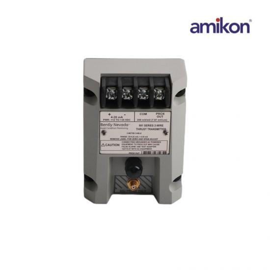 The 991-25-XX-01-CN is Vibration Transmitter.The 991 Vibration Transmitter is intended primarily for the original equipment manufacturers (OEMs) of centrifugal air compressors or small pumps, motors, or fans who prefer to provide a simple 4 to 20 mA proportional vibration signal as the input to their machinery control system. The transmitter is a 2-wire, looppowered device that accepts input from our 3300 NSv* proximity probe and its matching extension cable (available in 5 m and 7 m system length options).