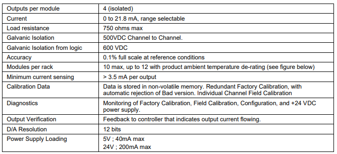 The Analog Output module provides 4 isolated 0 to 21.8mA outputs that may be scaled by the user to any spanwithin this range on a per output basis.A green blinking status LED on the module indicateswhen the module is being scanned. A red status LEDwhen module or channel diagnostics exist. A userspecified failsafe value is supported to allow predictableoperation in the event communication between themodule and the controller is interrupted.Outputs are updated synchronous with control execution.A user specified rate of change limit may be applied toeach output when needed.