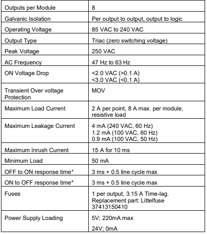 The AC Digital Output module provides 8 isolated zeroswitching Triac solid-state outputs. A shorting comb isavailable for use with barrier type terminal blocks tosimplify connections to a common voltage source for alloutputs. Each output has a MOV for transient overvoltage protection and a field-replaceable fuse.There is a green LED state indicator for each channel onthe module to indicate when a digital output is ON.A green blinking status LED on the module indicateswhen the module is being scanned. An amber blinkingstatus LED indicates when channels are forced and a redstatus LED when module diagnostics exist.