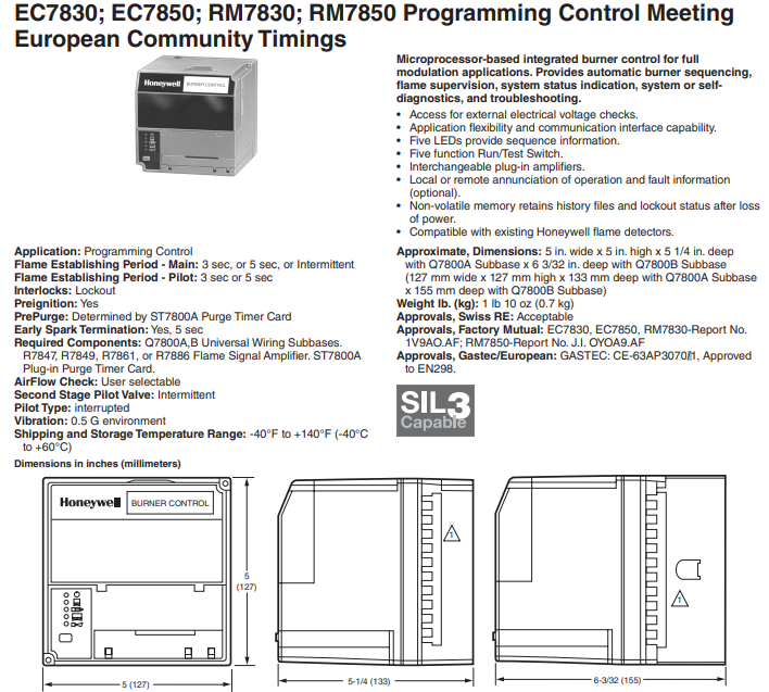 Microprocessor-based integrated burner control for full modulation applications. Provides automatic burner sequencing, flame supervision, system status indication, system or self-diagnostics, and troubleshooting.