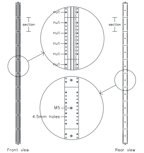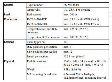 The MB-0001 mains power rail distributes a DC voltage in the range of 24Vdc—110Vdc from (multiple) redundant power supplies to its users.The MB-0001 mains power rail has 120 connection points and can distribute upto 200 Amps. Connection to the rail requires special connectors.They may be of type Jackscrew (JCK) or of type Squeeze-To-Release (STR), asshown in Figure 490 on page 783.